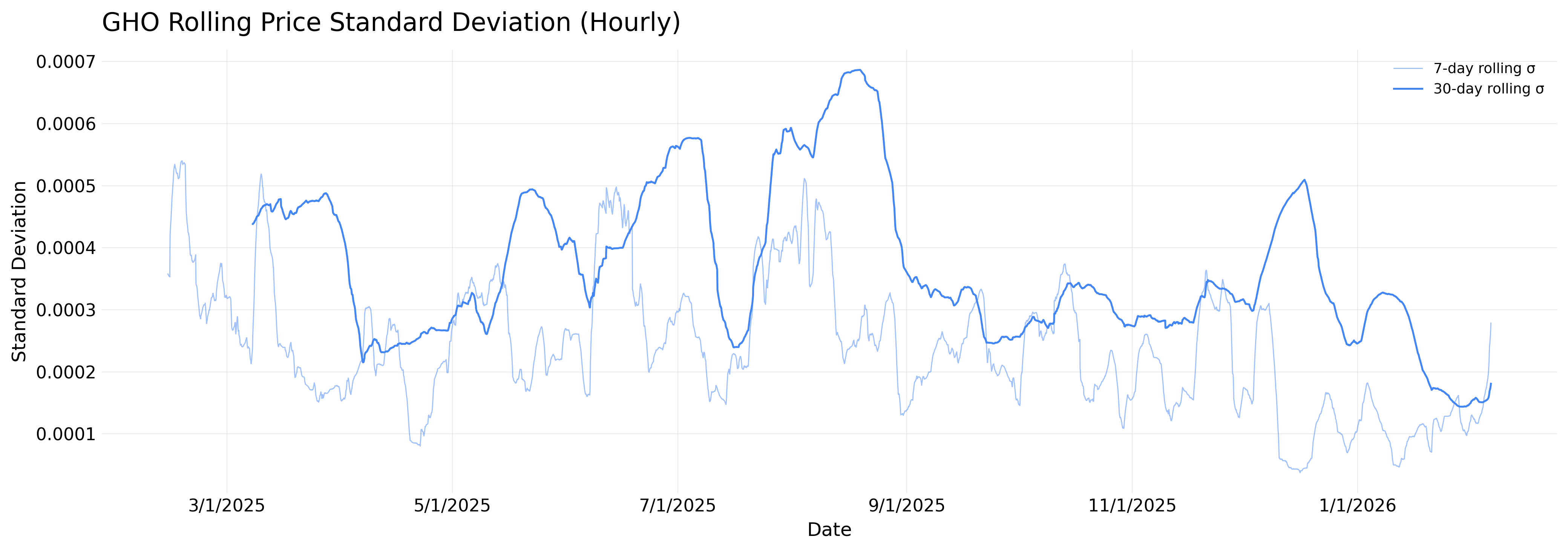 Structural stability: Rolling 24-hour volatility is lowest for USDC (0.27 bps), followed by USDT (0.94 bps), PYUSD (1.1 bps), GHO (1.02 bps), and frxUSD (1.45 bps). GHO is not the noisiest asset; its peg is consistently wider rather than unstable.