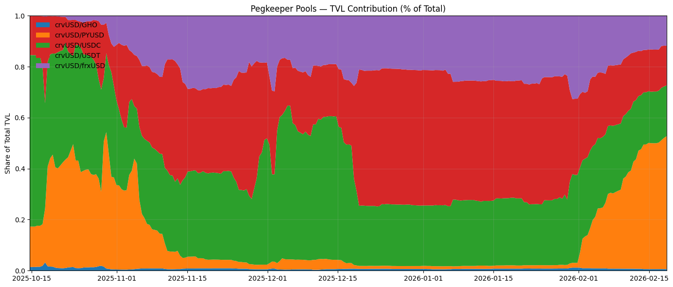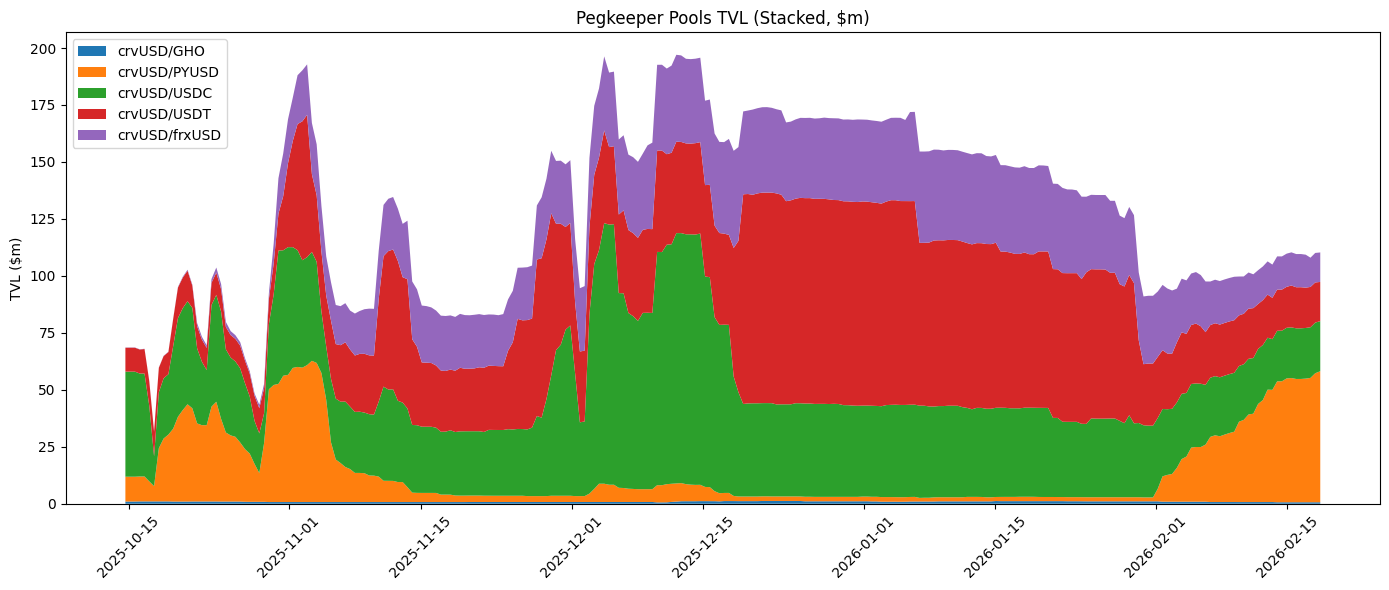 As of 2026-02-18, total pegkeeper TVL is approximately $110.35m, led by crvUSD/PYUSD at $57.54m (~52%), followed by crvUSD/USDC at $22.00m (~20%), crvUSD/USDT at $17.22m (~16%), crvUSD/frxUSD at $12.95m (~12%), while the candidate crvUSD/GHO pool remains small at $0.64m (~0.6%).