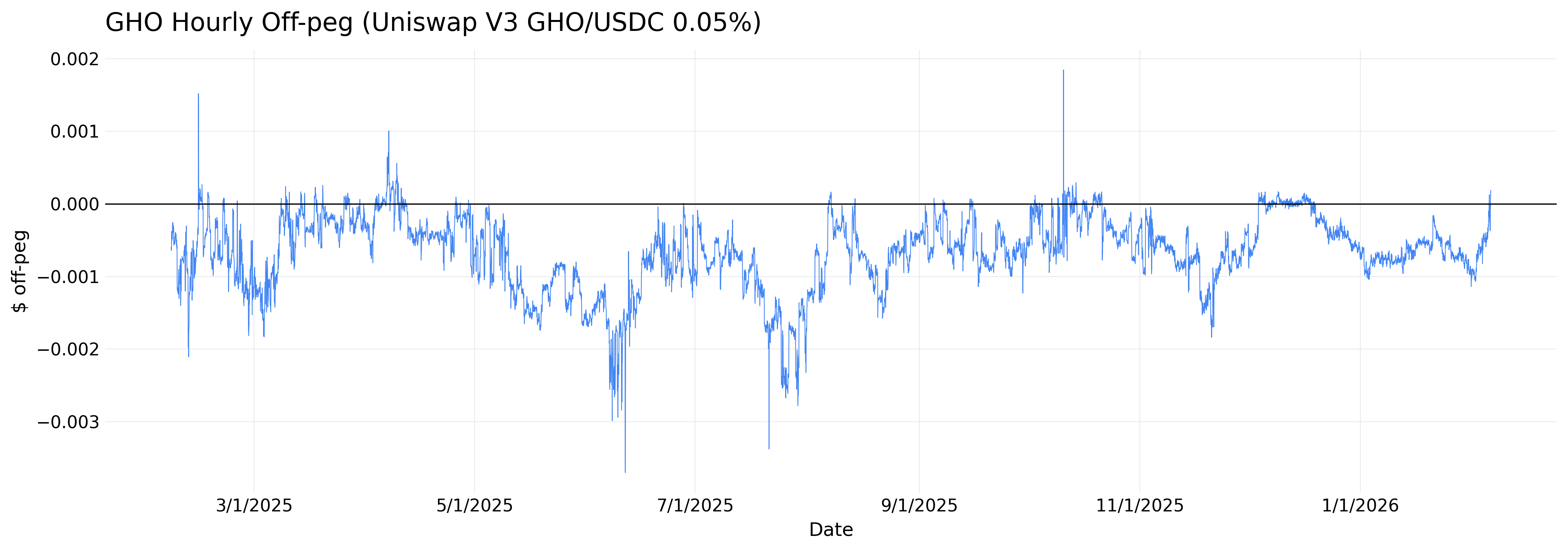 This analysis evaluates historical peg performance across USDC, USDT, frxUSD, and GHO using hourly price data sourced from Pyth. Prices were normalized to a $1 peg. For each asset, we computed deviation from peg (price − 1), absolute deviation, rolling 24-hour standard deviation, and rolling z-scores (mean-adjusted). We further measured tail quantiles and the proportion of time spent outside fixed deviation thresholds (10, 25, and 50 bps). All statistics are based on hourly closes and comparable time windows across assets.