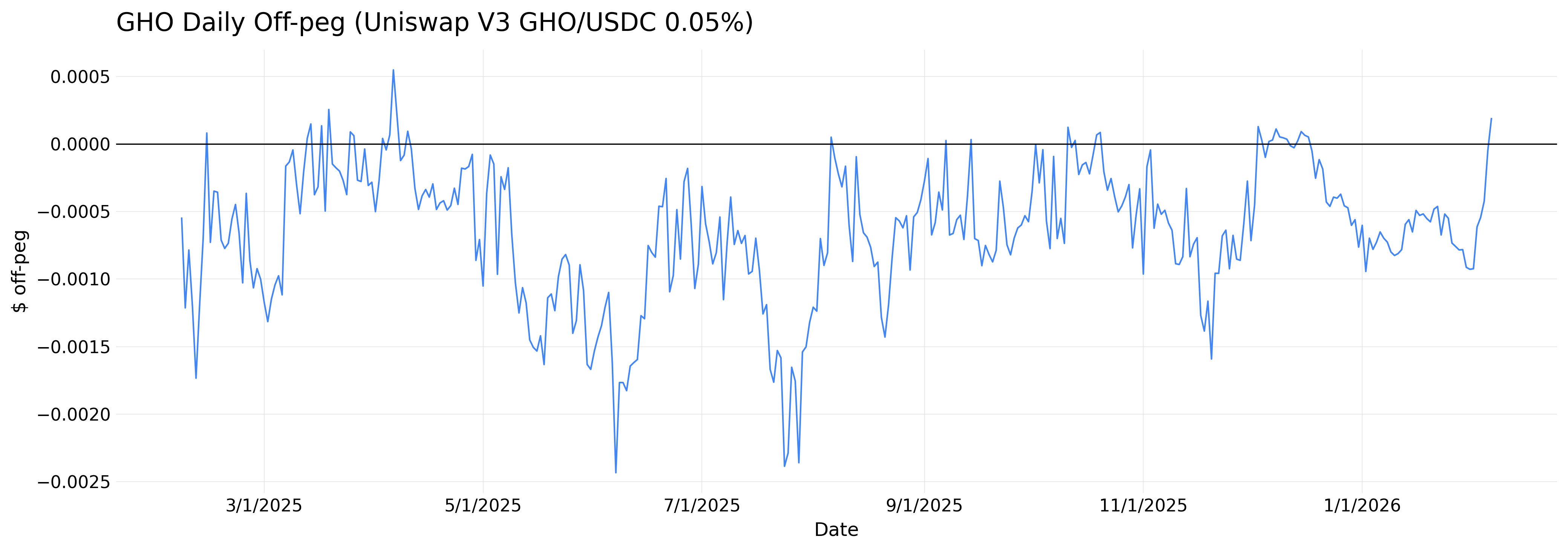 Tail risk: At the 99th percentile, USDC remains tightly anchored (3.3 bps), while PYUSD, frxUSD and USDT show moderate tails (~10–16 bps). GHO exhibits the heaviest tail (21.6 bps), though none of the assets breached 50 bps. GHO’s weakness reflects more frequent moderate deviations rather than extreme peg breaks.